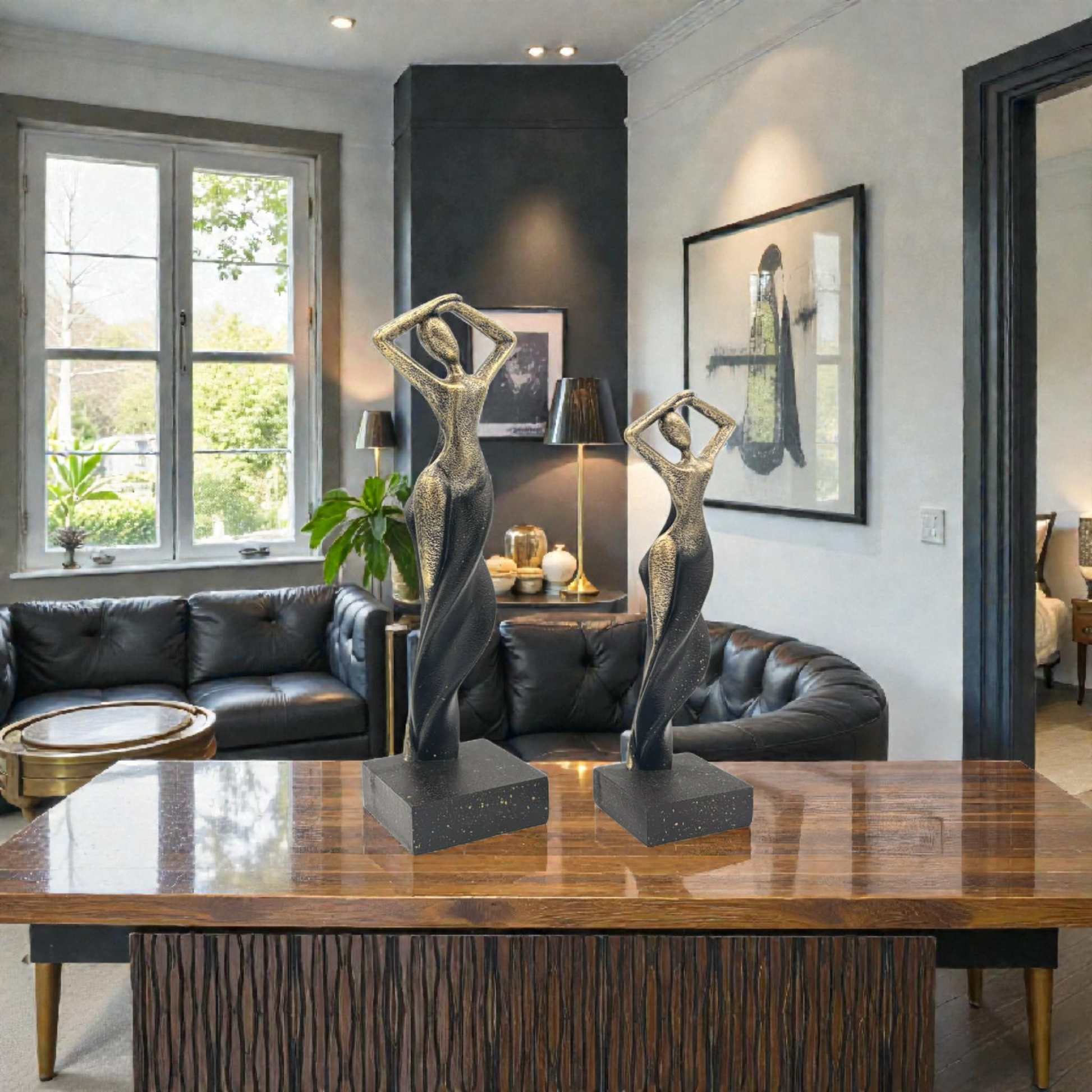 Elevate your interior with this abstract black and gold feminine sculpture set, designed to bring elegance, movement, and artistic depth to any space. Featuring two sculptural figures in different heights, the flowing twisted forms symbolize grace, confidence, and modern femininity, finished with subtle gold accents that add a touch of luxury.