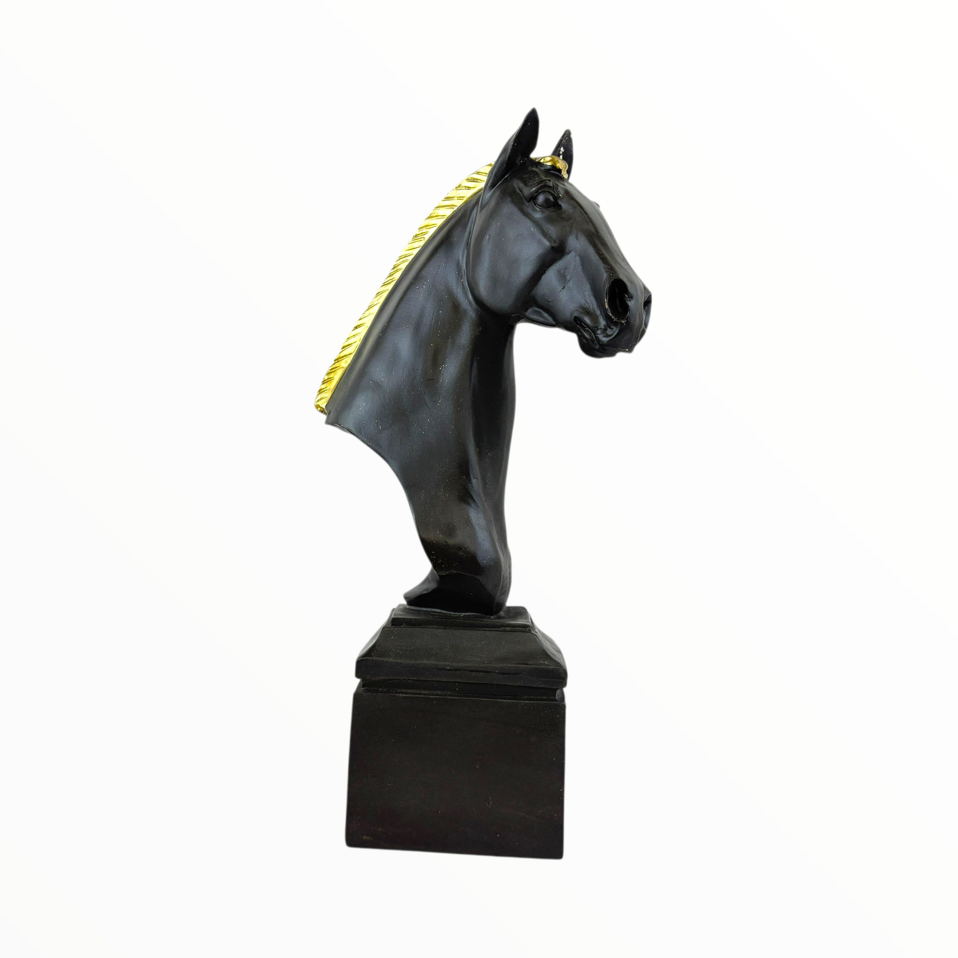 A refined and striking horse bust sculpture designed to bring elegance and character to any interior. Crafted in matte black with a subtle gold mane accent, this piece reflects strength, grace, and timeless style. Ideal for living rooms, offices, libraries, or entryway consoles. Adds a luxurious touch to modern, classic, and contemporary décor themes
