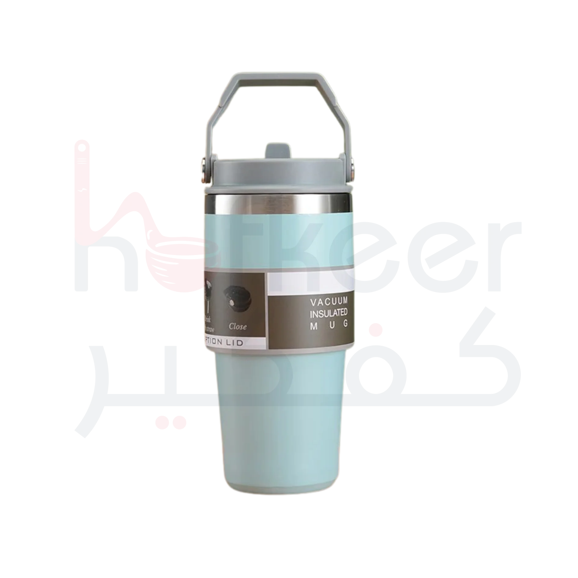 كوب ترافل أنيق ومتين مصنوع من الفولاذ المقاوم للصدأ بلون أزرق ناعم، مزود بغطاء متعدد الاستخدامات بثلاث خيارات: للشرب المباشر، استخدام القشّة، أو الإغلاق المحكم. مثالي للحفاظ على مشروباتك ساخنة أو باردة لساعات، ومناسب للأشخاص كثيري التنقل