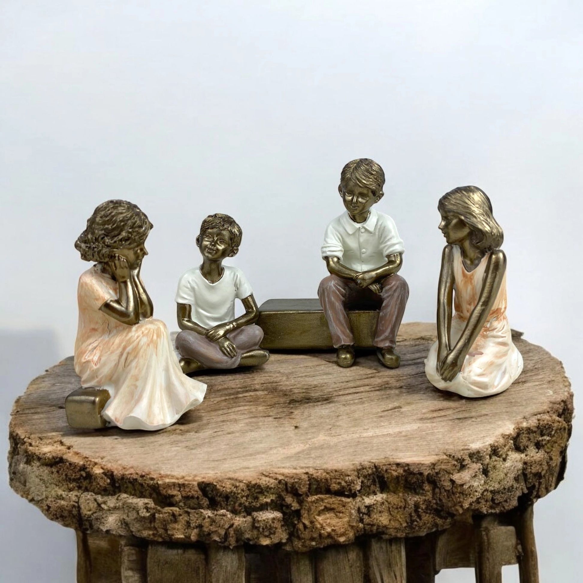 Set of bronze-finish figurines of four children sitting in conversation, with hand-painted details. A heartwarming decorative piece for shelves, tables, or living room displays.