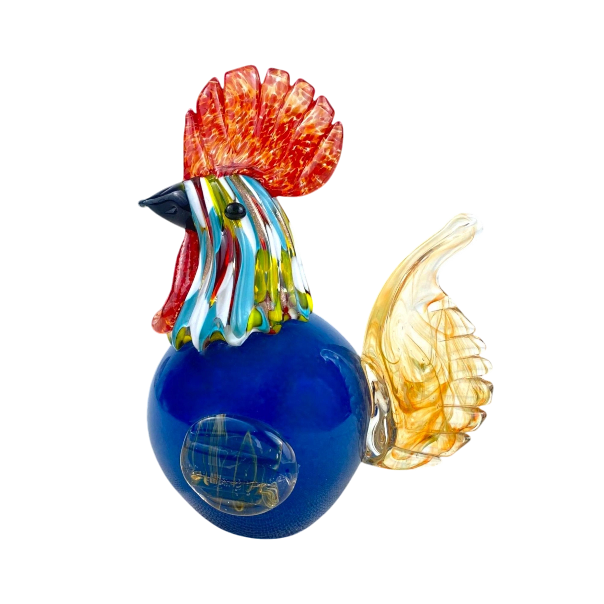 This vibrant, handblown glass rooster features a striking mix of bold colors, including a fiery red comb, bright yellow and green feathers, and a deep blue body. The intricate detailing and transparent tail give this piece a lively, dynamic appearance. A perfect statement piece for any room, this colorful rooster adds an artistic and playful touch to your home or office décor.