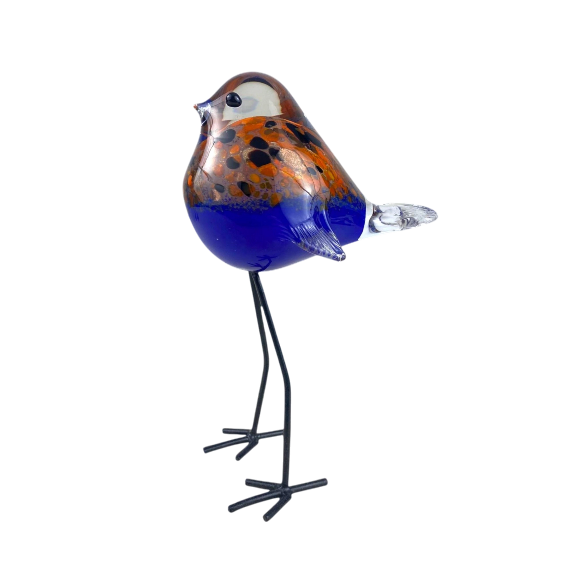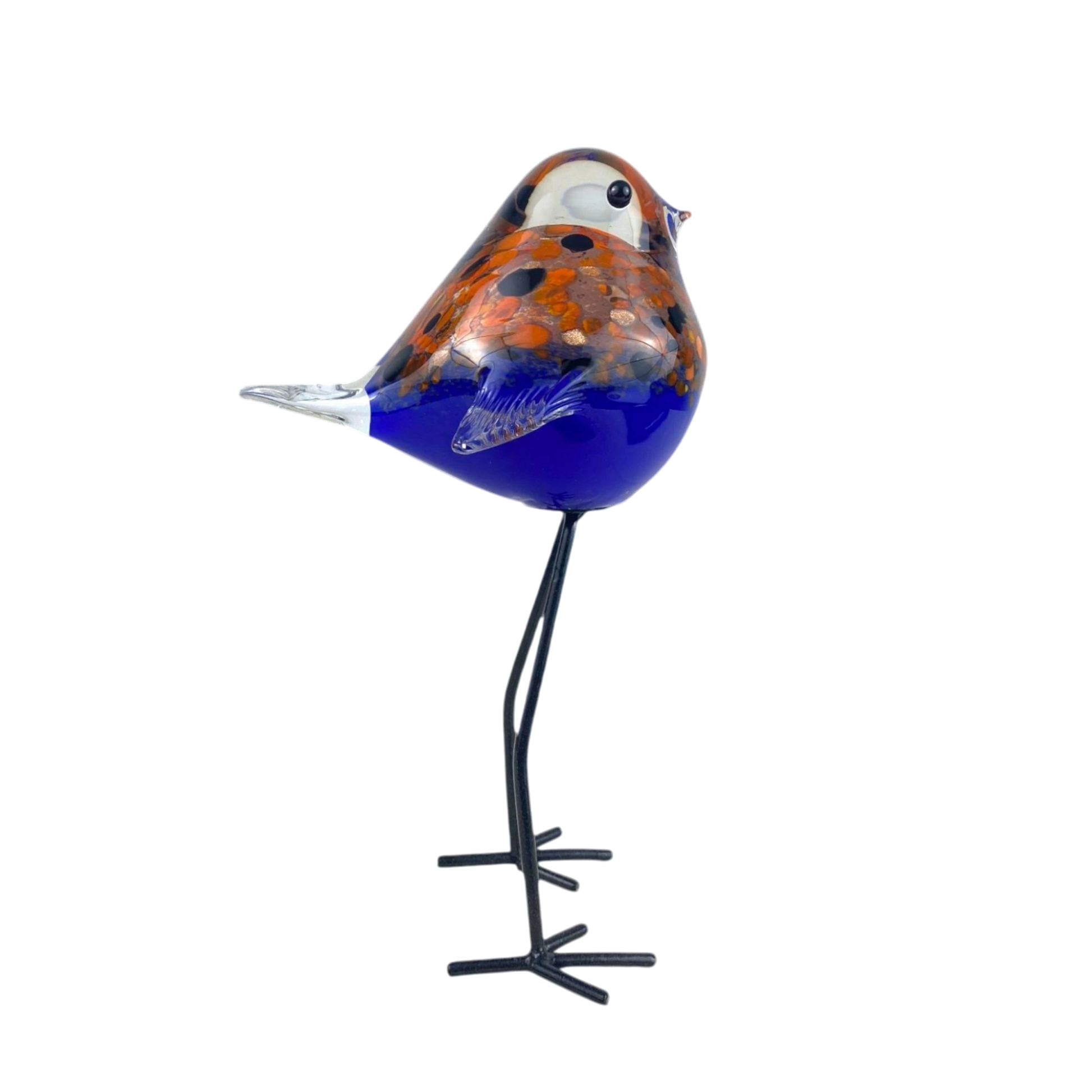 The EmberSky Crystal Bird is a stunning figurine that beautifully blends fiery warmth and deep serenity. With a rich amber-orange and black-speckled upper body transitioning into a deep cobalt blue lower half, this elegant bird stands gracefully on slender black metal legs. Its transparent tail adds a delicate touch, making it a captivating piece for collectors, home decor, or as a thoughtful gift symbolizing balance, transformation, and beauty.