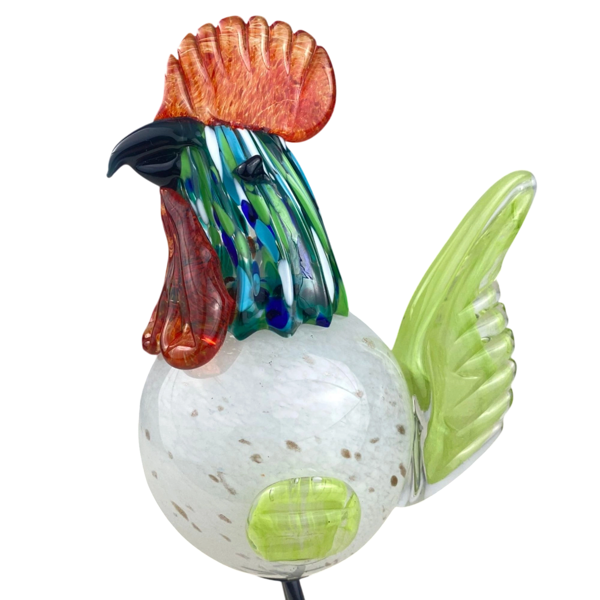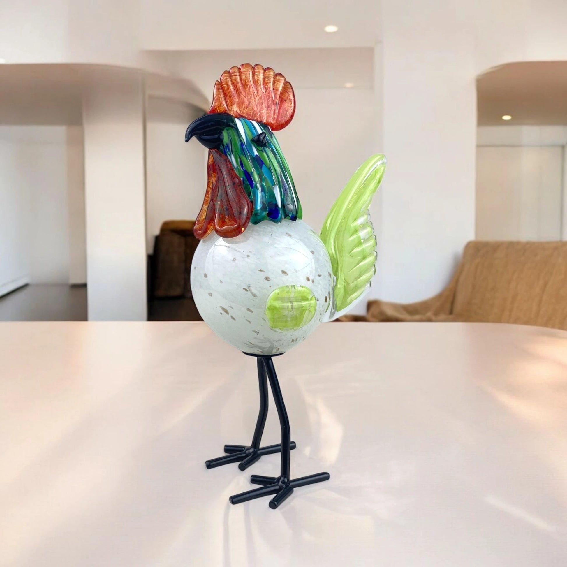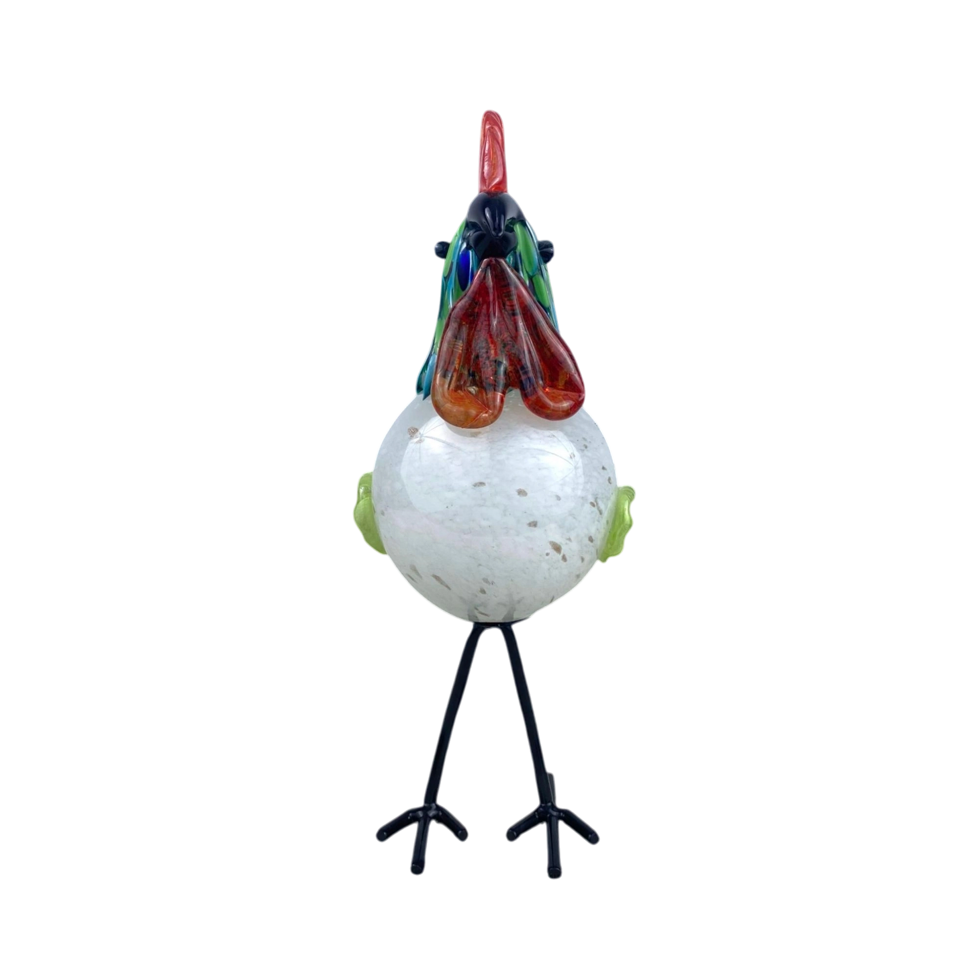 Add a touch of artistic charm to your space with this handcrafted glass rooster sculpture. Featuring a vibrant mix of colors—fiery red crest, iridescent blue-green neck, a speckled white body, and translucent lime-green wings—this unique piece is a stunning blend of craftsmanship and creativity. The delicate yet sturdy metal legs give it a lifelike stance, making it a perfect accent for home decor, offices, or as a thoughtful gift for art lovers and collectors.