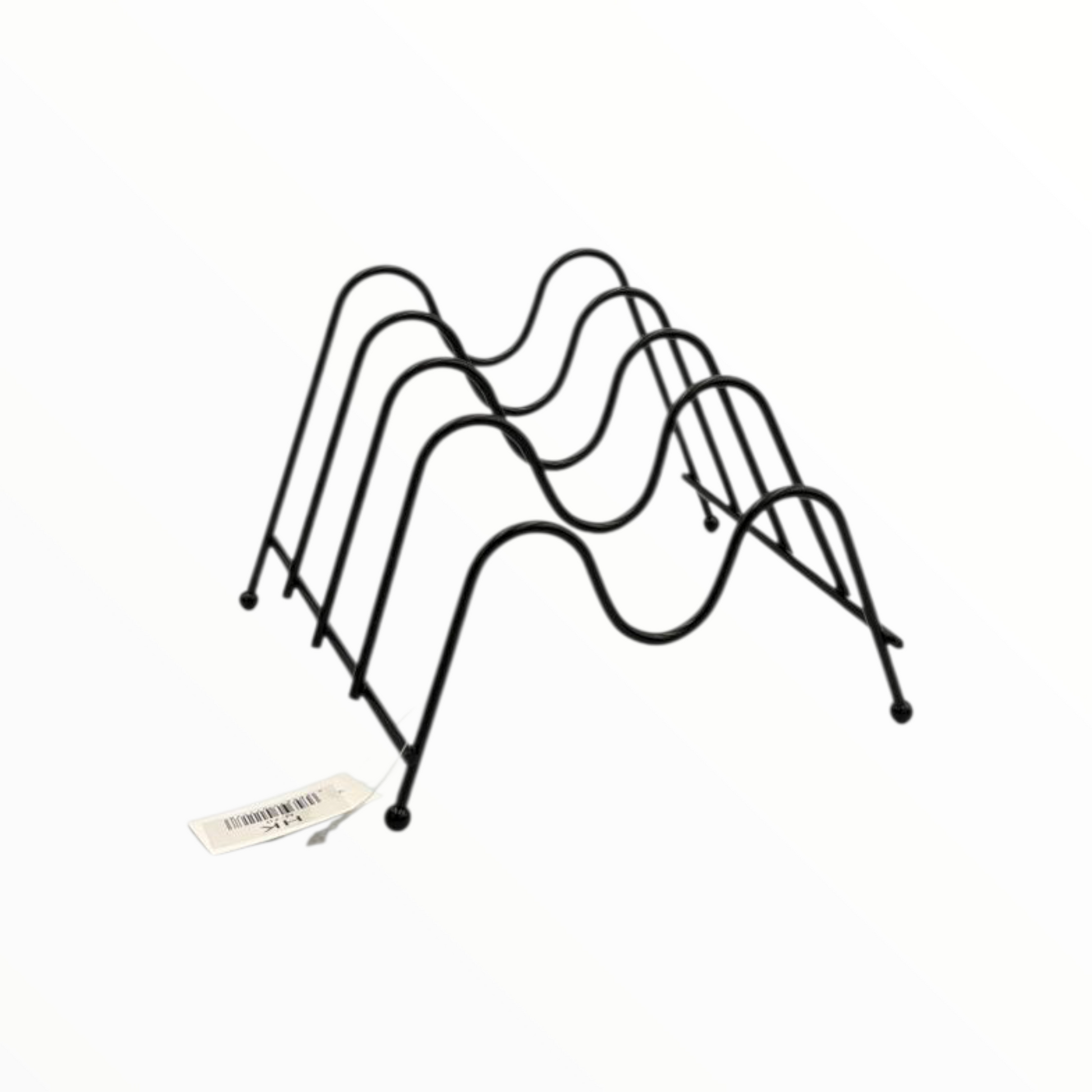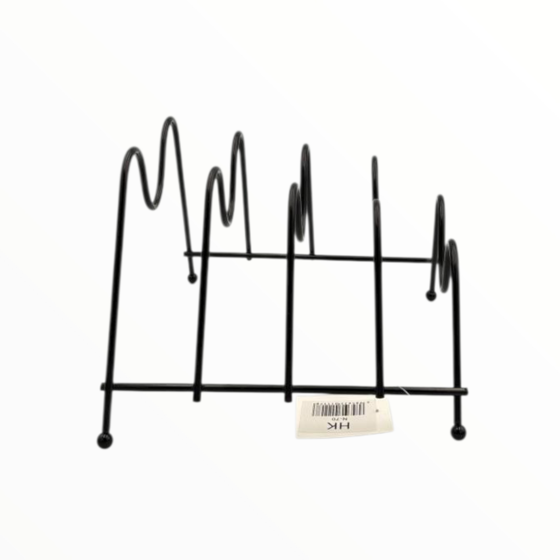 Space-saving metal pan organizer rack designed to neatly store frying pans, pot lids, baking trays, and cutting boards. Durable black coated steel with stable non-slip feet. Ideal for kitchen cabinets and countertops to keep cookware organized and accessible.