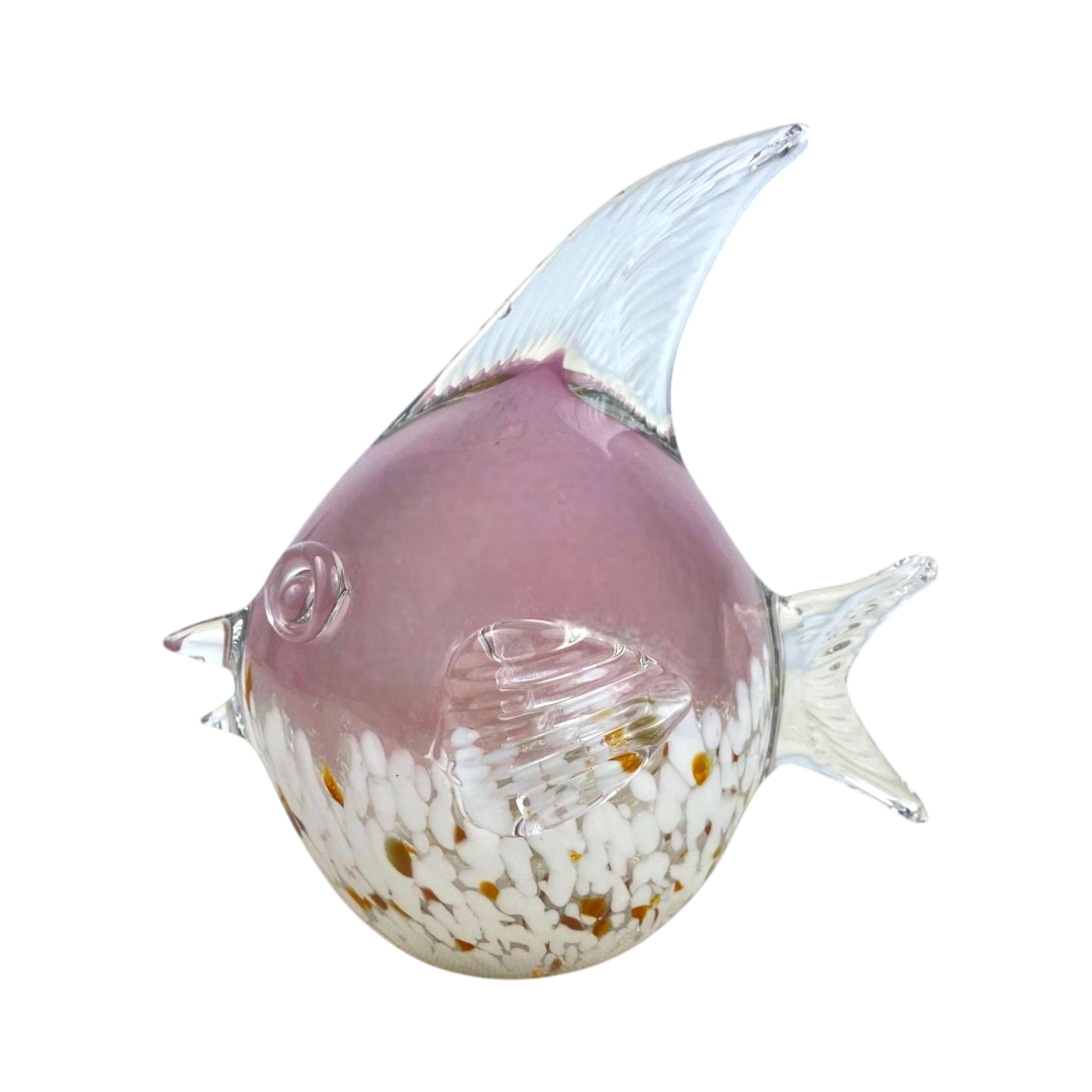 This stunning handcrafted glass fish features a soft purple hue that gradually blends into a delicate white and amber speckled base, creating a beautiful contrast. The clear glass tail and fins enhance its elegant and fluid design. Ideal for adding a sophisticated, artistic touch to any space, this unique piece brings a serene and vibrant ambiance to your home or office décor.