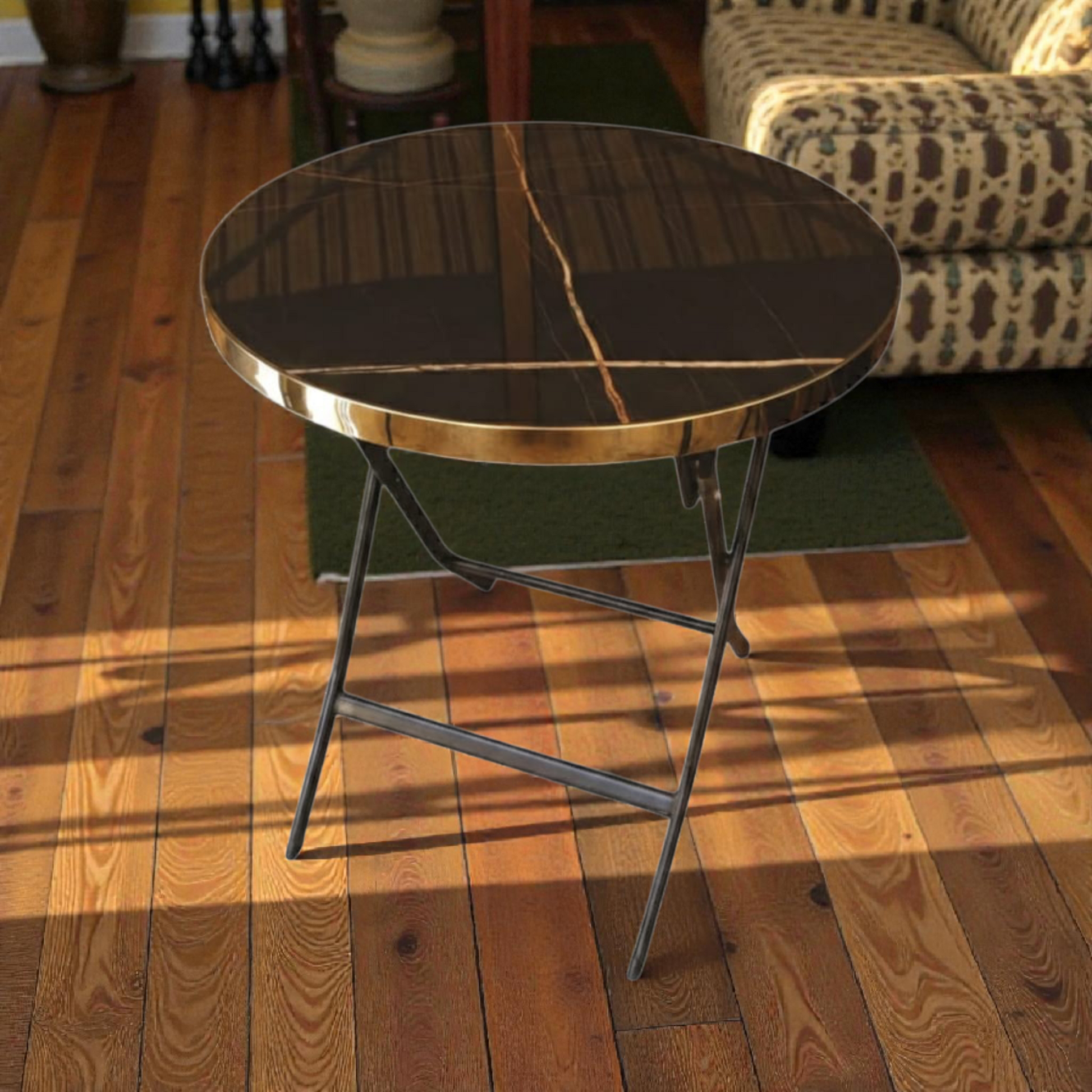 Elegant round side table featuring a brown marble-effect top with refined gold edging. Designed with a foldable metal base for easy storage and versatility, this 80 cm table is perfect for living rooms, balconies, or modern accent spaces.