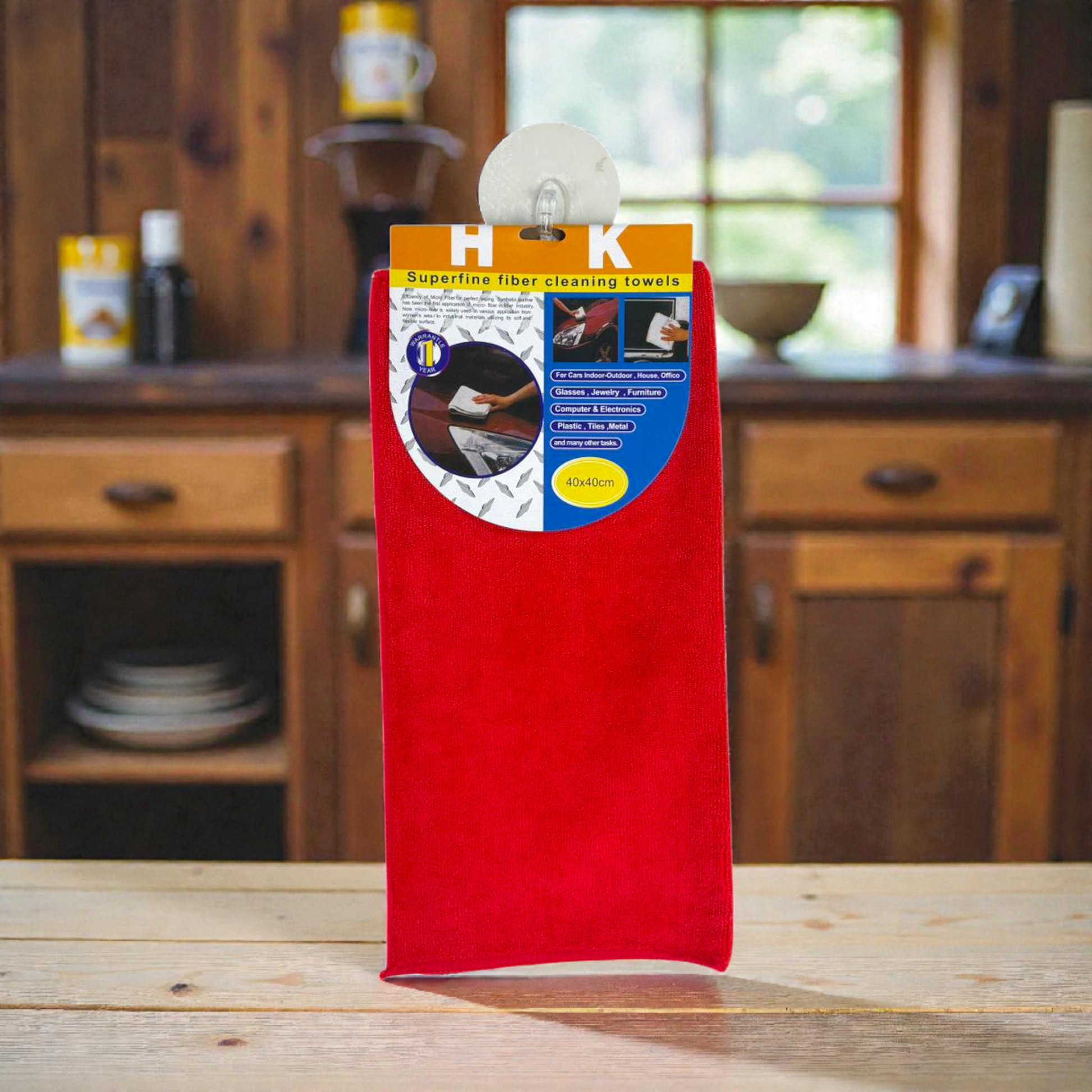 High-quality red microfiber towel designed for streak-free cleaning. Perfect for cars, kitchens, electronics, glass, and daily household use. Ultra-soft, super absorbent, and reusable