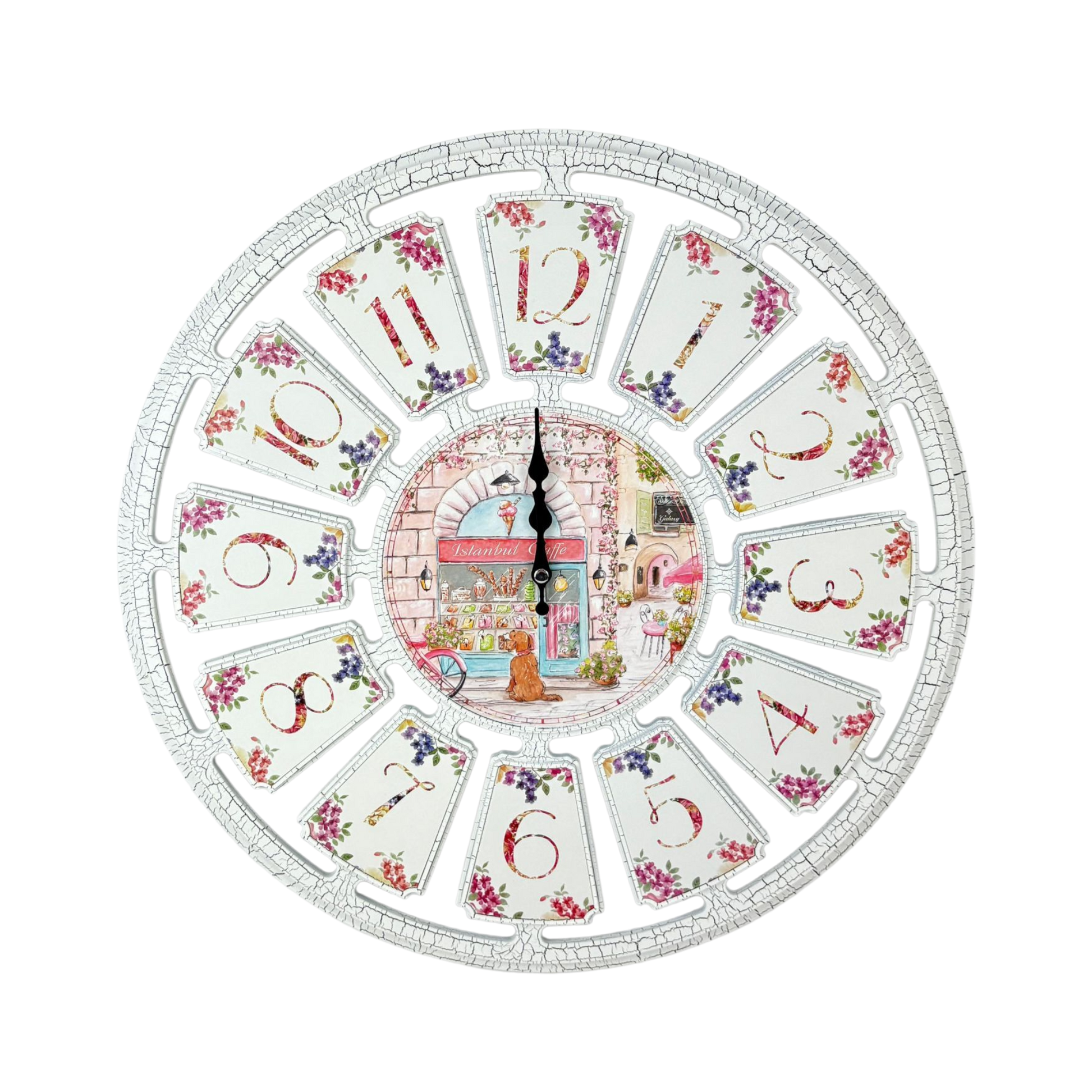 Charming vintage-style wall clock with floral details and a picturesque Istanbul Café illustration at the center. The distressed white frame adds a rustic touch, making it perfect for kitchens, living rooms, or classic interiors. Combines functionality with artistic beauty for timeless home décor.